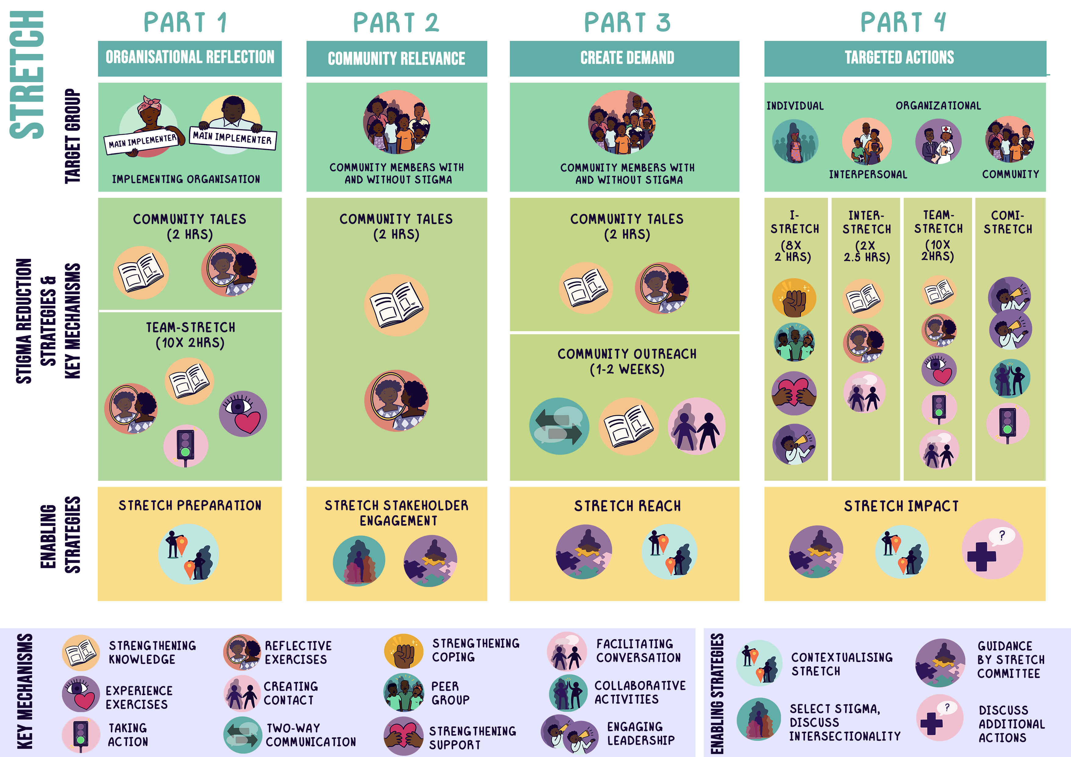 STRETCH - Stigma Reduction to Trigger Change - aims to build on and create community demand for stigma reduction. It stands out given its focus on children and adolescents and the aim to be applicable across stigmas. While STRETCH is intended to be implemented in its entirety, for reasons of feasibility components can be implemented independently.